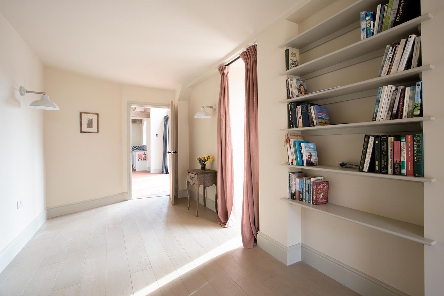 - Sitting room with limewashed oak floorboards. Floor to ceiling windows, a selection of books and games.