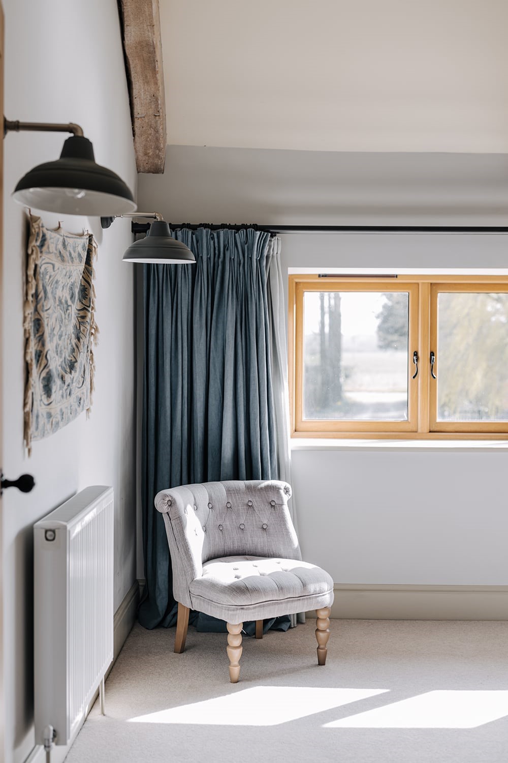 - 1 Twin. This bedroom is under the eaves with limewashed beams but hence limited headroom.